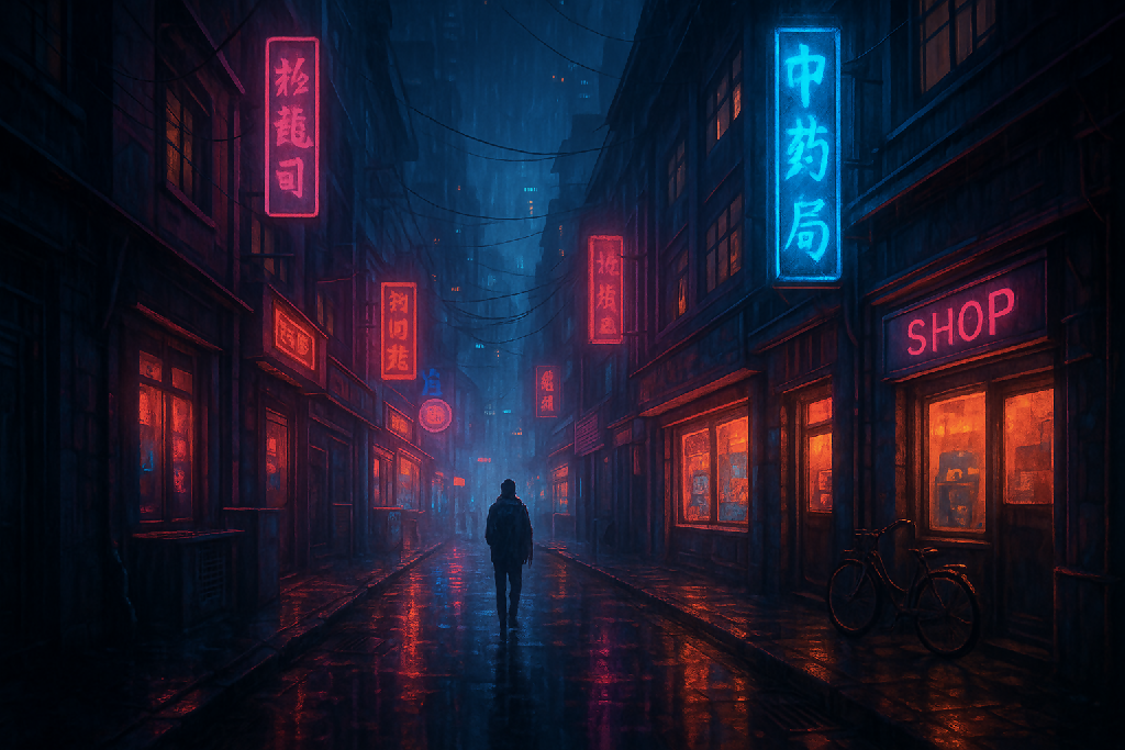 A captivating digital artwork depicting a rain-slicked cyberpunk city street at night, illuminated by vibrant neon signs and lights.