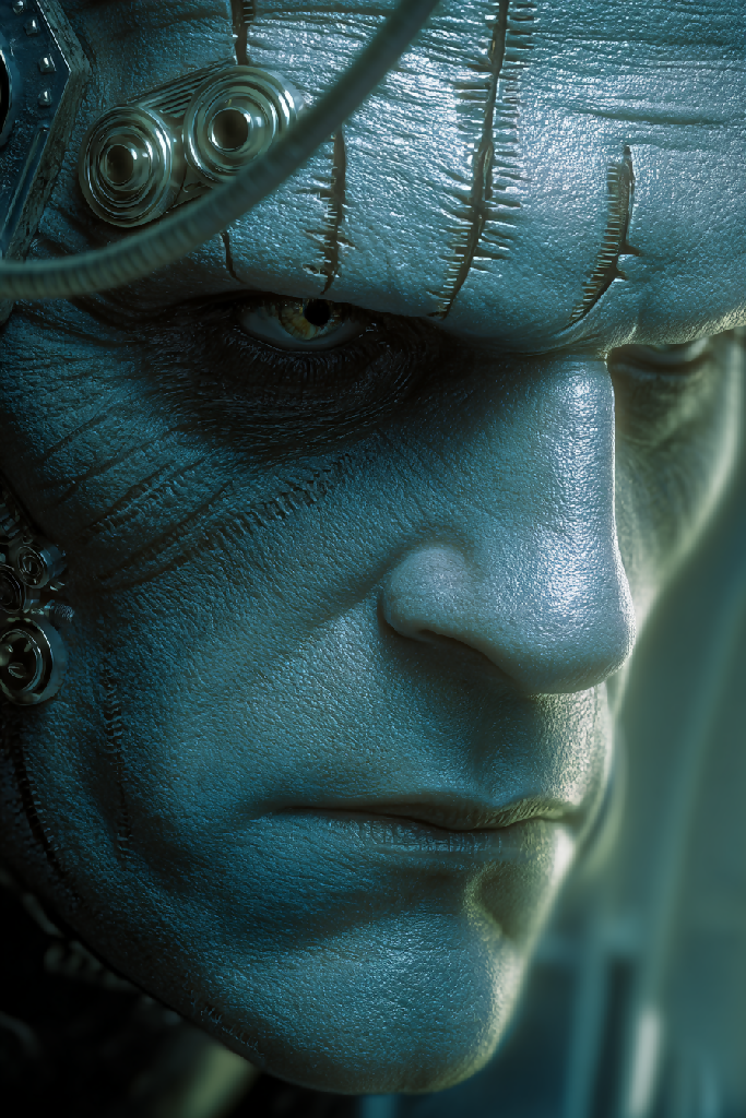 Tags: Frankenstein, cyborg, digital art, sci-fi portrait, metallic texture, bluish green, biomechanical, synthetic face, advanced technology, artificial life