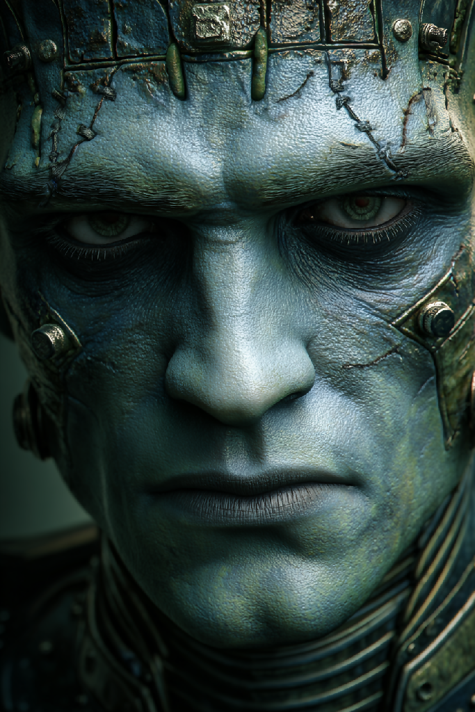 Tags: Cyborg Frankenstein, digital art, sci-fi armor, synthetic skin, futuristic design, biomechanical, metallic texture, green and blue tones, artificial power, cybernetic monster