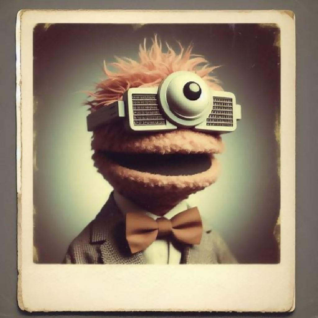 The image shows a puppet character with orange, fuzzy hair and a large, open mouth. The puppet is wearing a brown bow tie and a tweed jacket. The most distinctive feature is the large, single eye in the middle of its face, which is part of a pair of futuristic-looking glasses. The image has a vintage, Polaroid-style border, giving it an old-fashioned appearance. This image is interesting because it combines elements of classic puppetry with a modern, sci-fi twist, creating a unique and whimsical character.