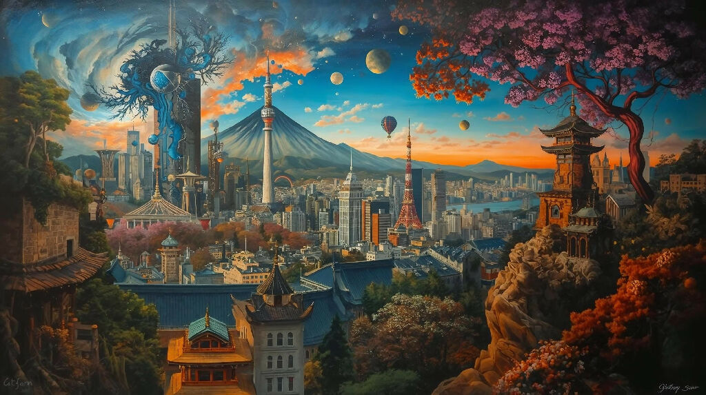 Surreal painting of Tokyo with a Dali touch.