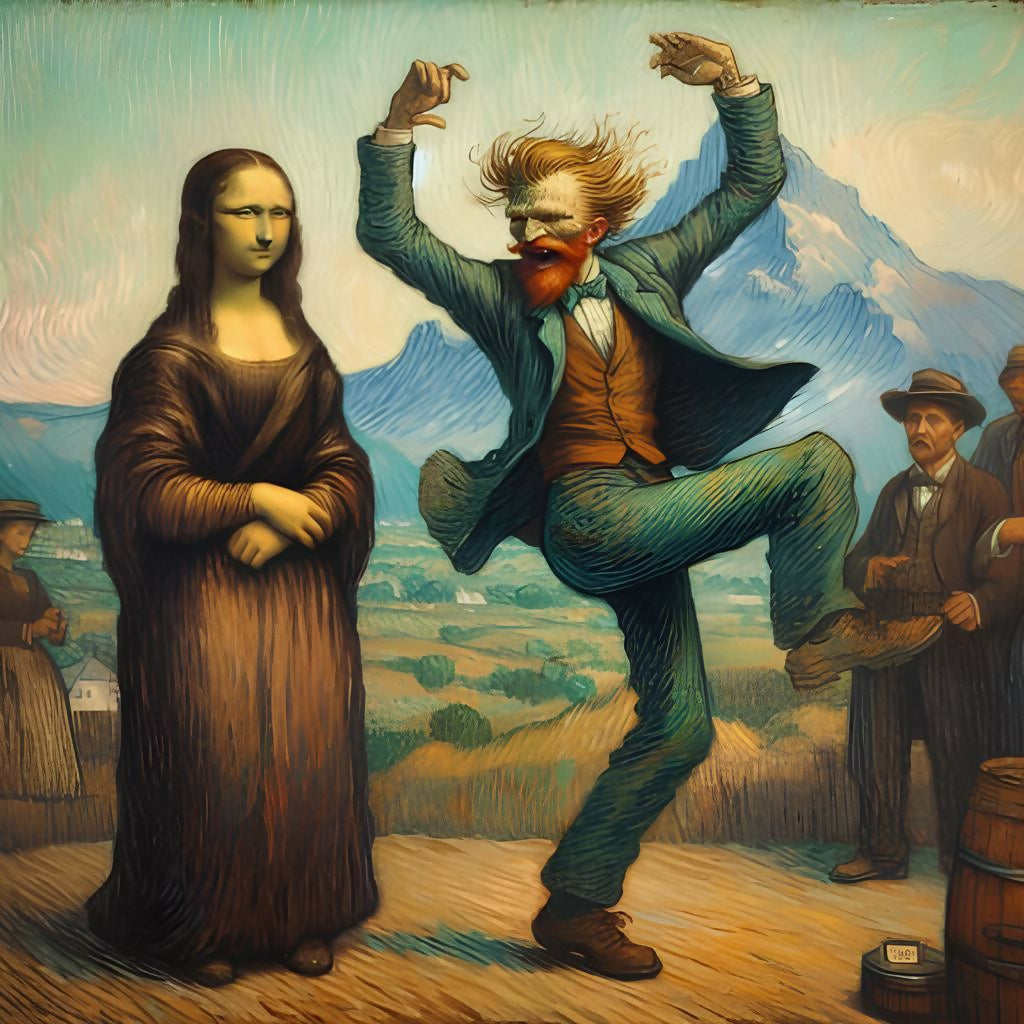 An imaginative AI artwork showing Van Gogh joyfully dancing with Mona Lisa, blending iconic art history with surreal charm in a whimsical, dreamlike celebration of creativity.