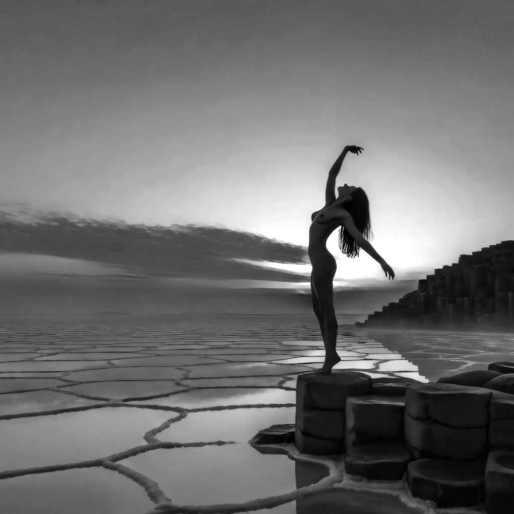 Dramatic black and white photo of a woman in an expressive dance pose, standing on hexagonal basalt columns in a vast, cracked salt landscape.