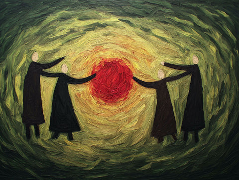 This painting features four human-like figures in long, dark robes, surrounding a glowing red orb in the center. Their heads are simple and abstract, with pale, faceless circles, and their arms stretch outward as if connected or locked by an unseen energy. The background swirls with dynamic textures in shades of green and yellow, creating a sense of motion and energy radiating outward toward the edges. The fiery red orb is the focal point, exuding warmth and light that contrasts with the darker, cooler tones of the figures and the environment. The brushstrokes are thick and expressive, giving the painting an emotional, almost tangible energy. The scene evokes ideas of unity, mystery, ritual, or perhaps the human connection to something greater than themselves.