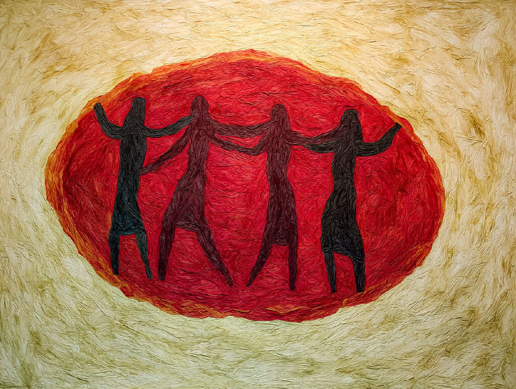 The painting presents four stylized figures standing in a circle, connected by their outstretched arms, within a large, textured red oval shape. The oval dominates the composition and suggests a symbolic space or energy field. The figures are silhouetted, rendered in dark tones ranging from black to deep red-brown, with minimal detail, giving them a universal and somewhat abstract quality.