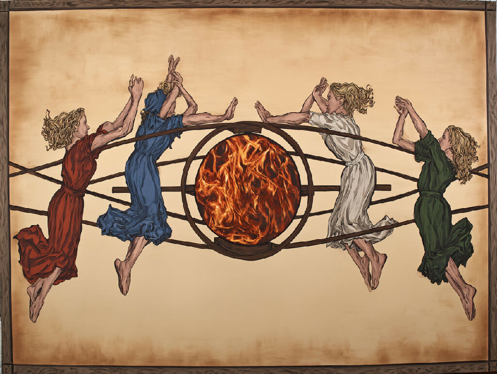Overall, the painting conveys a sense of unity, connection, and shared energy. The circle formed by the figures and the encompassing red oval reinforce these themes, suggesting a community or a collective bond. The abstract nature of the figures allows for a broad interpretation, while the bold colors and textures create a visually striking and emotionally resonant image. The texture emphasizes a feeling of unity, warmth, and a shared, almost primal connection.