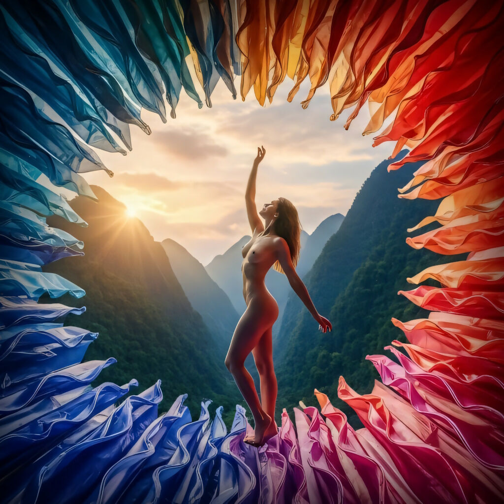 Vibrant color portrait of a woman celebrating freedom in a mountain valley, beautifully framed by a circle of flowing, multicolored fabrics.