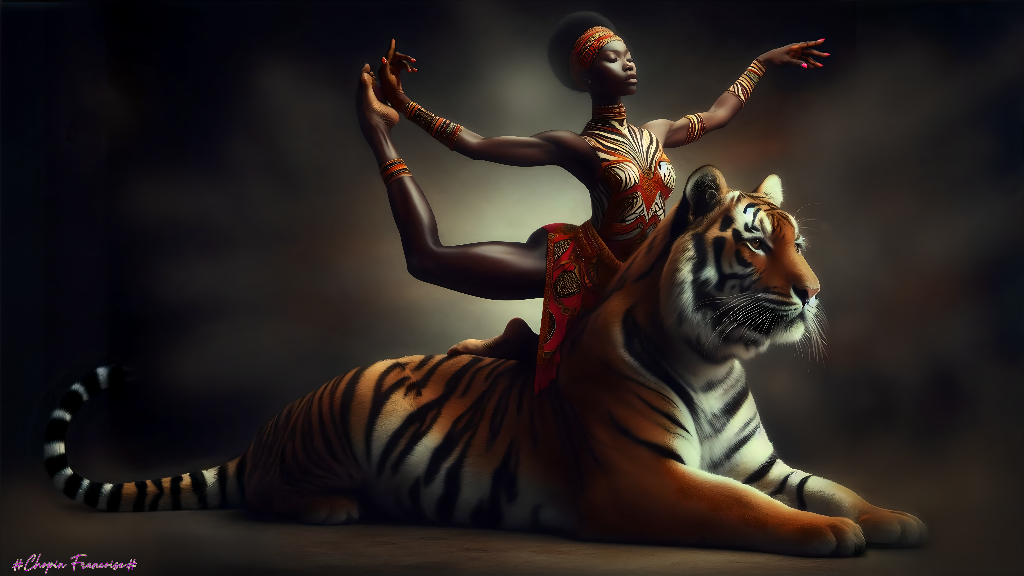 La pose confiante de la danseuse et la présence imposante du tigre donnent un sentiment de puissance et de contrôle
