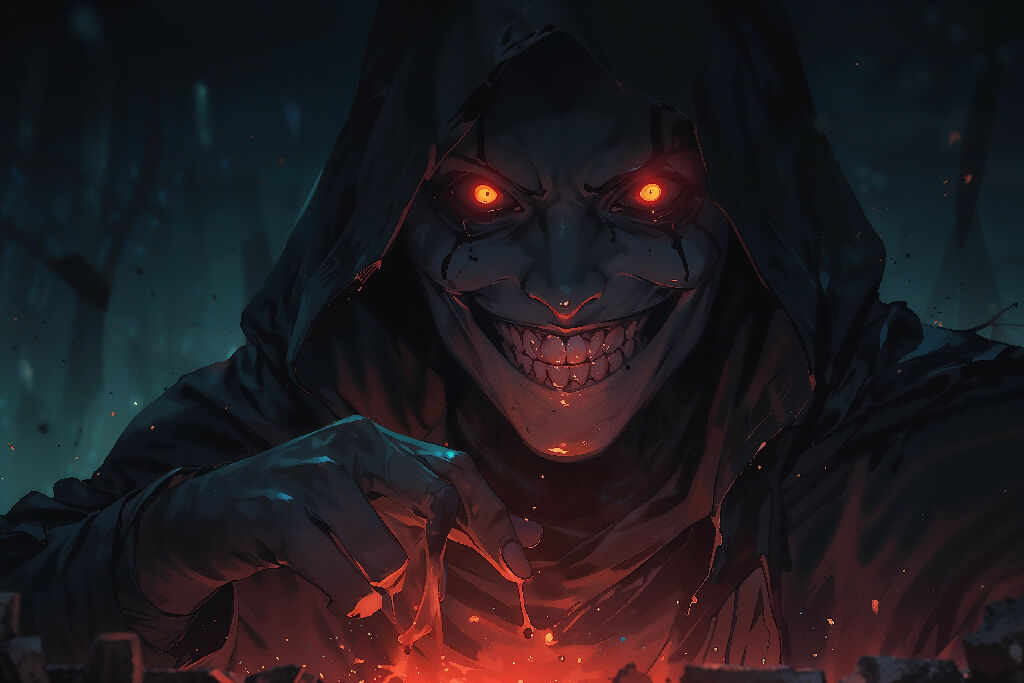 Dar fantasyk, eerie digital illustration featuring a sinister figure with glowing red eyes and a wide, menacing grin. filled with dark, indistinct shapes, enhancing the overall sense of dread and mystery.