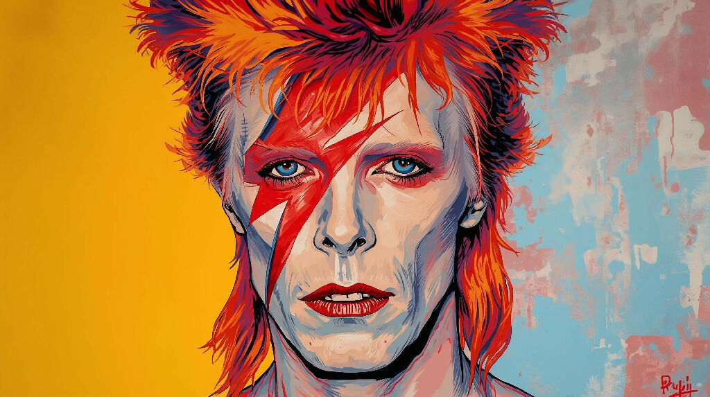 Vividly colored, detailed portrait of Rock Icon David Bowie.