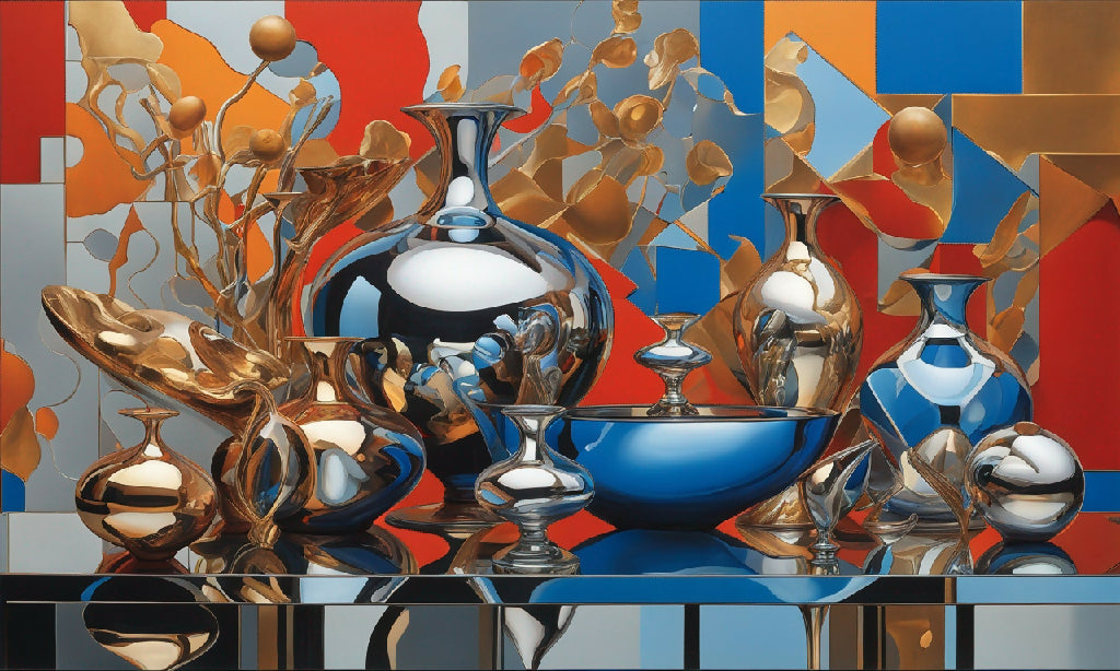 A vibrant still life painting, showcasing a harmonious blend of metallic vases, bowls, and spheres in a palette of golden, blue, and silver hues. These reflective objects are set against a geometrically-divided backdrop, which dazzles with bold red, orange, blue, and gray tones. The painting skillfully combines the elegance of classical still life with the dynamism of geometric abstraction, creating a visually striking interplay of textures, sheen, and a vibrant, eye-catching color scheme.