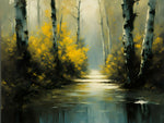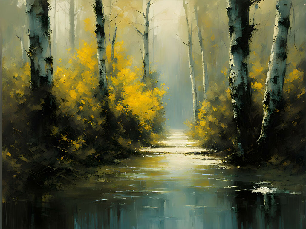 Deep Colors of Autumn: Birch Landscape. This painting captures the beauty of autumn in a birch forest. The high contrast colors and textured brush strokes create a sense of depth and movement, making it a true work of art.