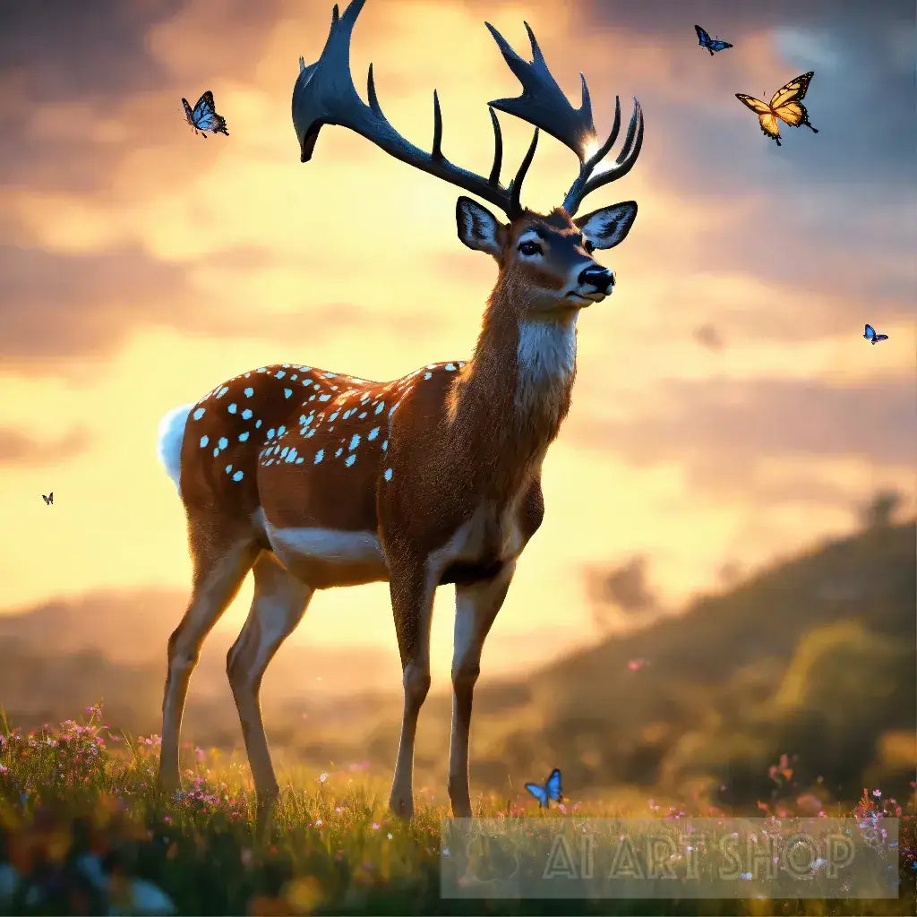 Standing Proud, female deer, on top of grassy, butterflies, hill, realistic, unreal engine render, Cinematic, backlight, 4k