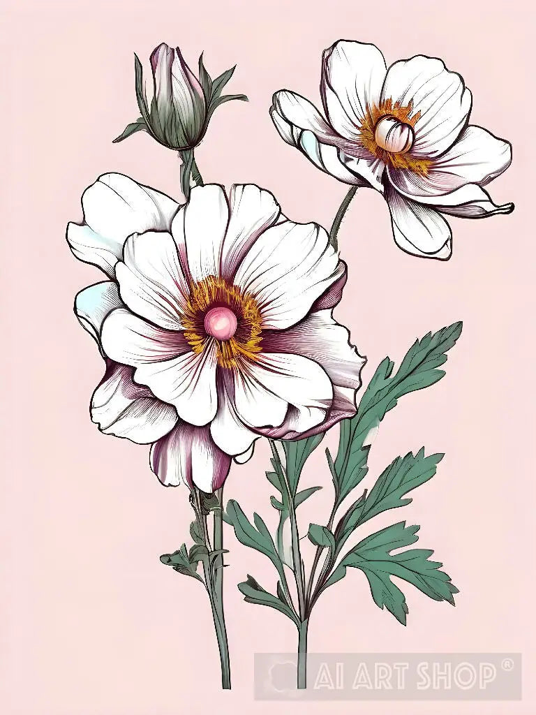 This charming artwork features two delicate white flowers against a soft pink background. The minimalist style and calming colors create a sense of peace and tranquility, making it a perfect addition to any home or office.
