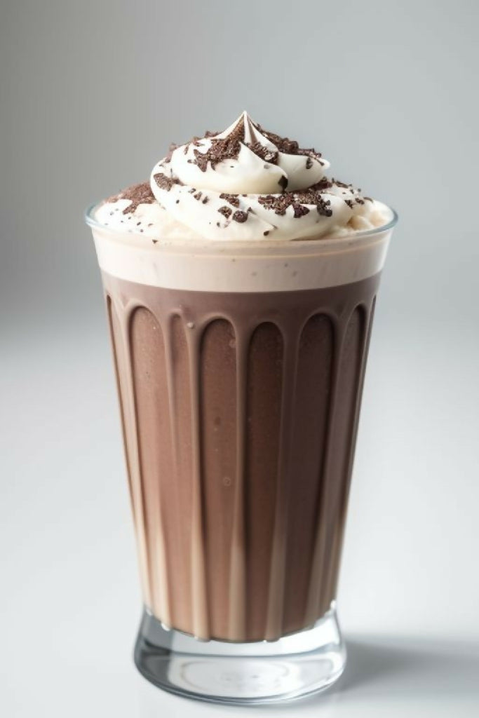 A glass of delicious chocolate milkshake is placed on a white surface. Grey background.