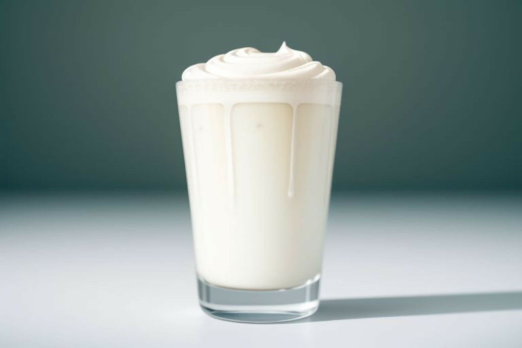 A glass of cold vanilla milkshake with yummy cream on it. It looks delicious to drink as a refreshment.
