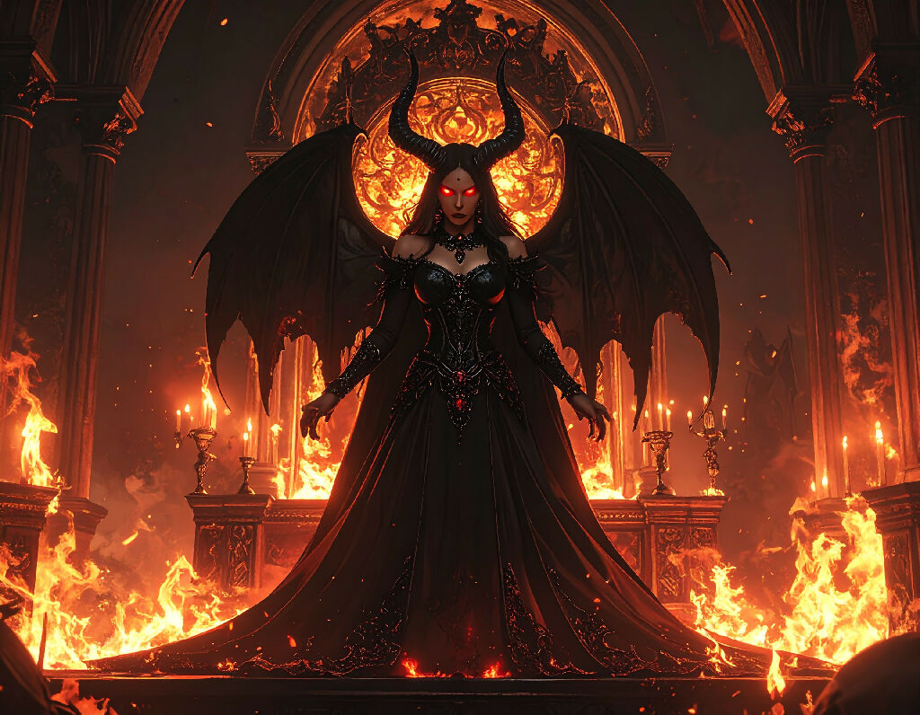 Step into the shadows with this hauntingly beautiful digital artwork of the Demon Queen of the Abyss. With glowing red eyes, majestic horns, and a flowing black gown, she reigns over a fiery underworld throne room. This ultra-realistic dark fantasy art is perfect for fans of gothic themes, fantasy lovers, and horror enthusiasts. A powerful addition to your wall art collection or fantasy-themed project.