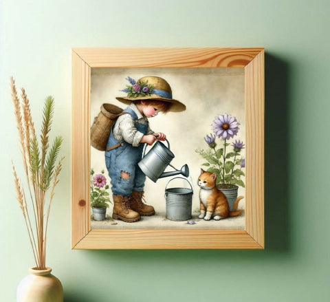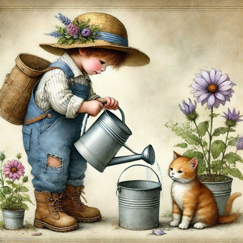 Ein Aquarellgemälde, das einen Jungen mit einer Gießkanne zeigt. Eine Katze sitzt vor einem Blumentopf mit lila Blumen und schaut dem Jungen zu.