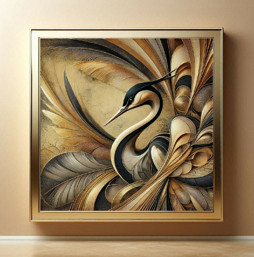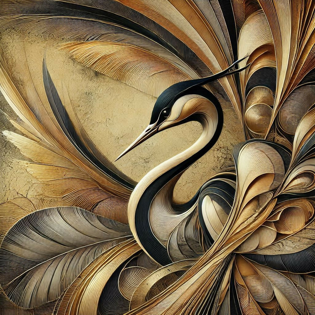 Ein Kranich, der in Gold-, Beige- und Schwarztönen gehalten ist und von einer komplexen, ornamentalen Struktur aus geschwungenen Linien und Formen umgeben ist, die an Federn oder Blätter erinnern. Der Stil ist abstrakt und kunstvoll, mit starken Kontrasten und einer schnellen metallischen Anmutung.