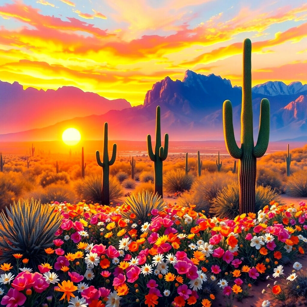 A breathtaking desert landscape unfolds beneath a fiery sunset sky, where towering saguaro cacti stand like sentinels among a sea of wildflowers. Vibrant daisies and poppies burst with color in the foreground, their delicate petals glowing in the warm light. In the distance, rugged mountains rise dramatically, their snowy peaks contrasting with the arid terrain below. This AI-generated artwork captures the rare harmony between harsh desert beauty and fleeting floral life—an ode to resilience, serenity, and the quiet magic of twilight.