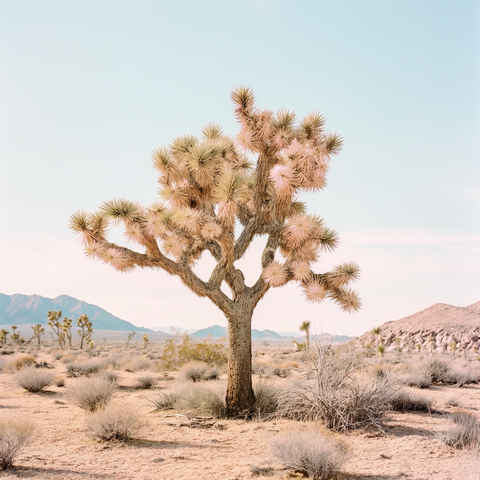 A minimalist landscape shot on medium format film captures the stark beauty of a lone Joshua Tree. Taken with 35mm Portra film, the scene features muted pastel colors that evoke a dreamy, serene atmosphere. The bright background is awash with ultralight pinks, baby blues, peachy oranges, and pastel yellows, creating a soft, ethereal glow. The Joshua Tree stands in sharp contrast, its dark, rugged silhouette providing a striking focal point against the delicate, bright hues that envelop the horizon. The overall composition is simple yet captivating, highlighting the natural elegance of the desert landscape.