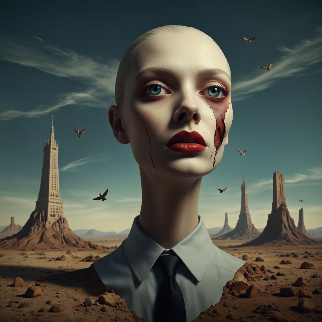 Deserted Elegance captures the haunting beauty of a surreal desert landscape where human and architectural forms merge in a dreamlike scene. A striking, ethereal woman with porcelain-like skin and cracked features stands against a backdrop of towering, ancient structures rising from the sands. The contrasting elements of her modern attire and the desolate environment evoke a sense of timelessness and mystery. With vivid details and a touch of surrealism, this artwork invites viewers to explore the boundaries between reality and imagination.