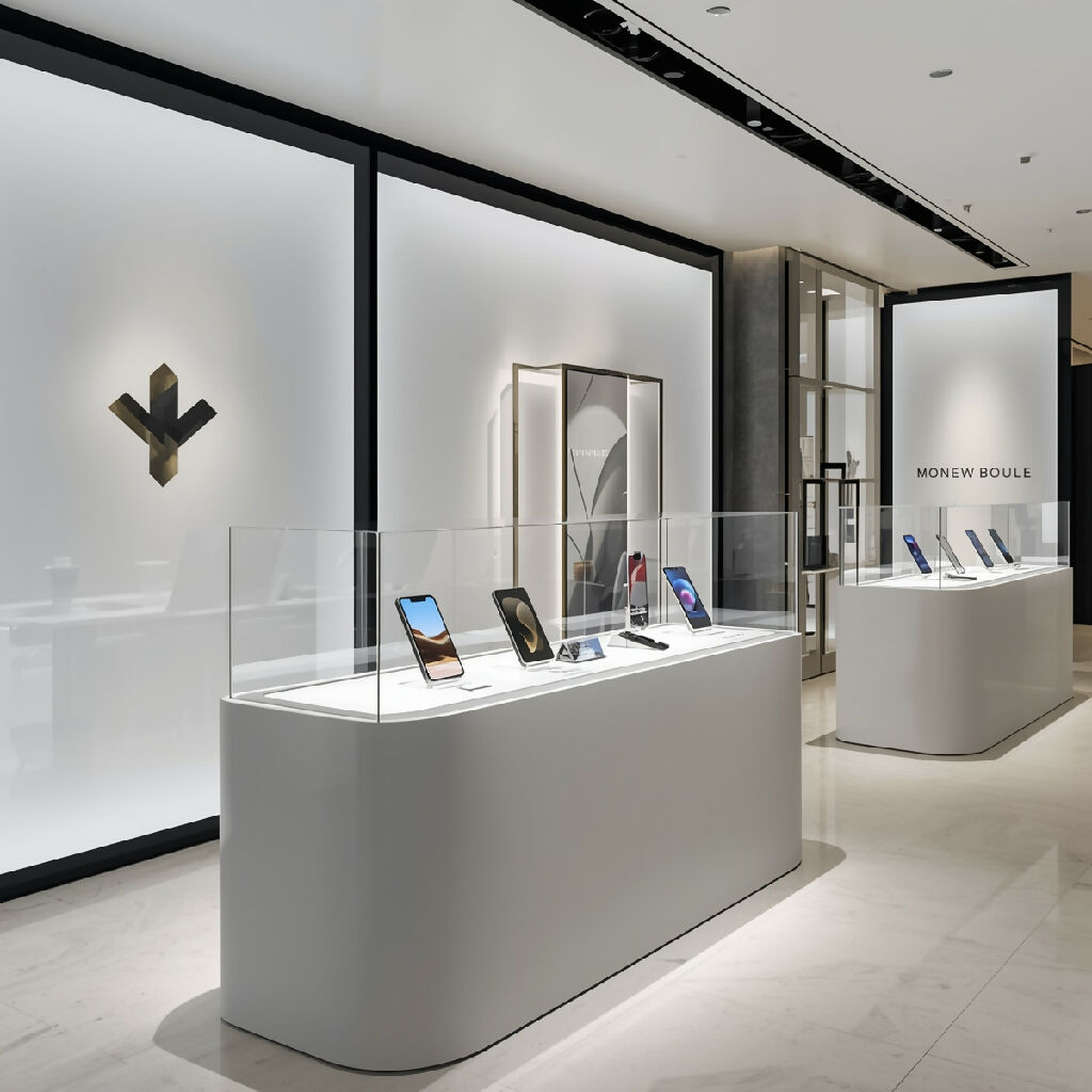Design of sleek and modern display cases for showcasing high-end smartphones in a luxury retail setting, with a focus on elegant lines, minimalist aesthetics, and clever use of lighting to highlight the devices' features, set against a crisp white or muted gray background to maximize visual appeal, with subtle branding elements such as a metallic logo or discreet typography in a clean sans-serif font, surrounded by plenty of negative space to create a sense of sophistication and exclusivity.