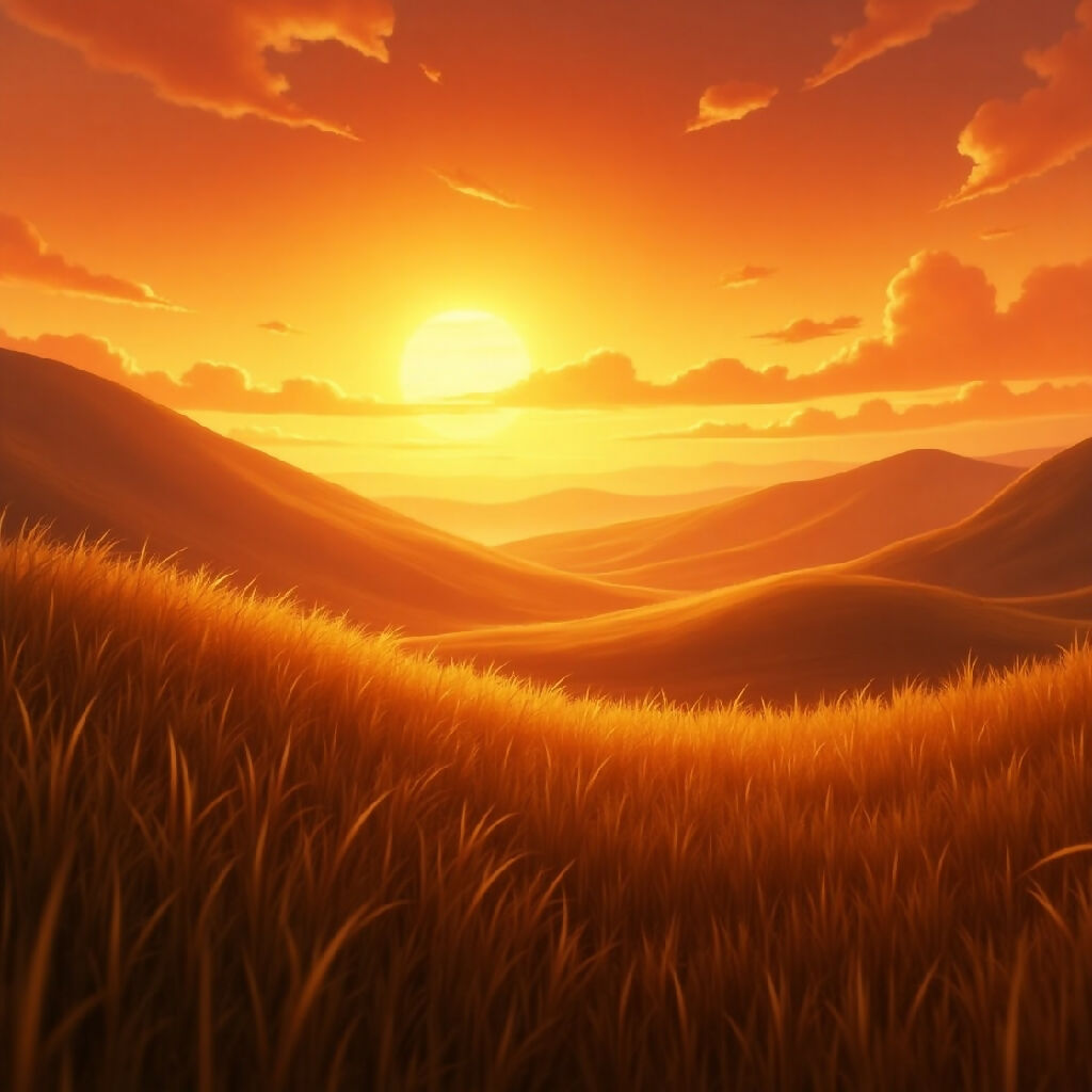 a vast valley with rolling hills, bathed in a warm orange sunset glow. The wind sweeps across the tall golden grass, creating a mesmerizing ripple effect. The atmosphere is dramatic and intense, evoking the feeling of an epic legend. The sky is painted with rich hues of amber and crimson, with wisps of clouds stretching across the horizon. A cinematic, animated fantasy style, inspired by Studio Ghibli and DreamWorks, with soft but vibrant lighting and dynamic movement. The sound of distant war drums fills the air, setting a powerful and mysterious mood.
