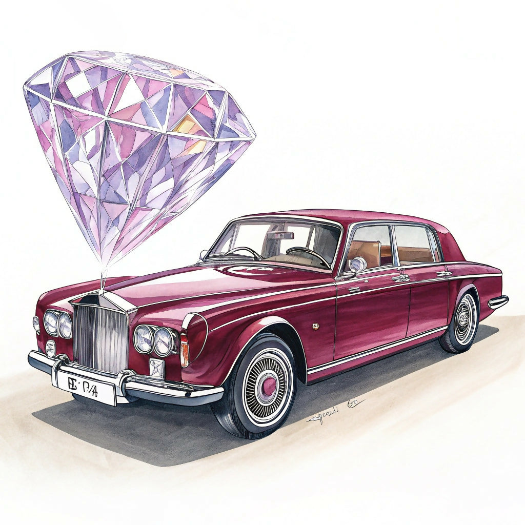 A hand-drawn or painted illustration depicts a burgundy Rolls-Royce, likely a Silver Shadow or similar model, with a large, multifaceted, purplish-pink diamond or gem suspended above it. The gem appears to be floating, seemingly supported by an unseen mechanism.