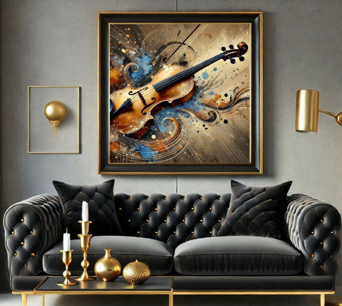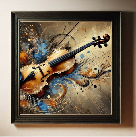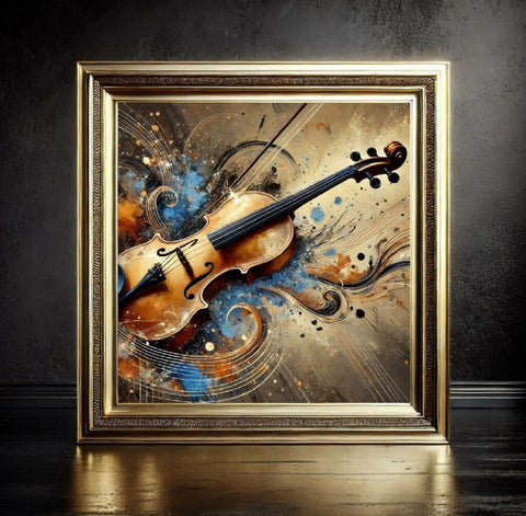 Das Bild zeigt eine Geige, die zentral in einer abstrakten, künstlerischen Darstellung platziert ist. Die Geige ist detailliert gezeichnet und ist aus Holz gefertigt, mit einem warmen, goldenen Farbton. Der Hintergrund ist eine Mischung aus Farbflecken, Schwüngen und Linien in Blautönen und Ockerfarben, die einen dynamischen und expressiven Eindruck erwecken. Das Gesamtbild wirkt künstlerisch und vielleicht etwas surreal.