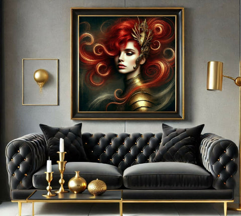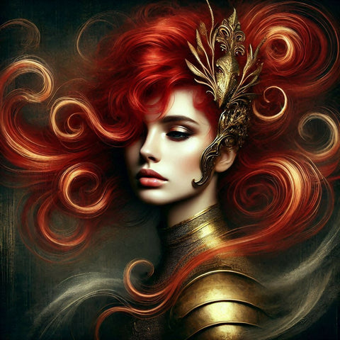 Eine Frau mit leuchtend roten Haaren, die in kunstvollen Locken um ihren Kopf stilisiert sind. Sie trägt eine goldene Kopfbedeckung, die an einen Lorbeerkranz erinnert, und goldene Rüstung. Der Hintergrund ist dunkel und geheimnisvoll. Der Gesamteindruck ist fantastisch und magisch.