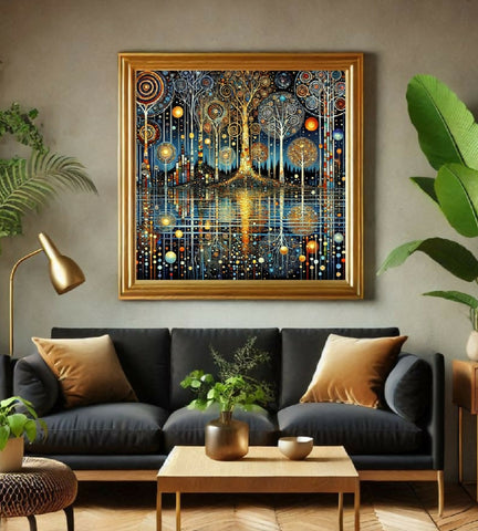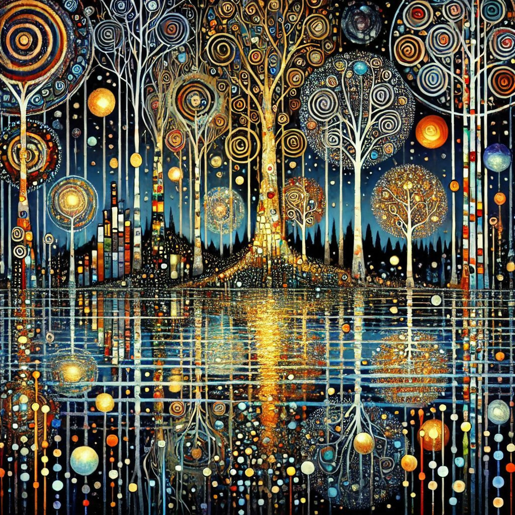 Dieses Bild ist ein faszinierendes Beispiel für fantasievolle Kunst, das eine märchenhafte Waldszene mit leuchtenden Farben und komplizierten Details darstellt. Ein See spiegelte die bunten Bäume mit ihren spiralförmigen Kronen wider, die wie leuchtende Ornamente am Nachthimmel wirken. Die Stadt am Horizont, dargestellt durch eine Reihe vertikaler, farbig abgesetzter Rechtecke, fügt eine unerwartete, aber passende urbane Note hinzu. Das gesamte Bild strahlt eine geheimnisvolle und träumerische Atmosphäre aus, die den Betrachter in eine Welt voller Magie und Wunder entführt.