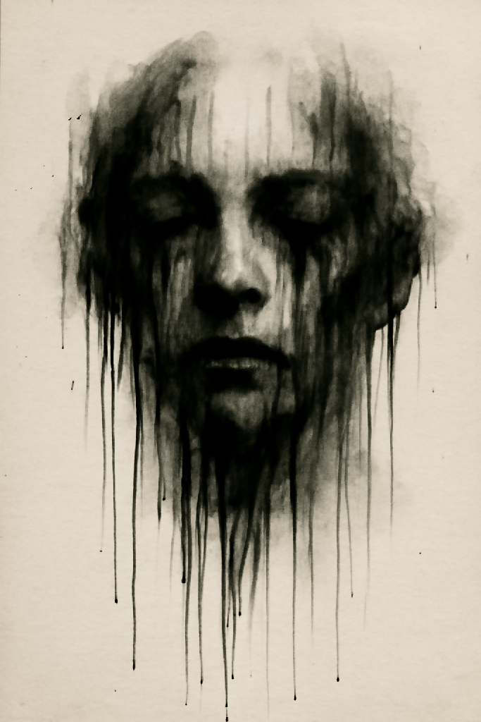 This striking monochrome ink sketch on textured off-white paper features a distorted face, with dripping black strokes that evoke an eerie, emotional tone. The portrait combines abstract and expressionistic elements, with the face’s features blending into fluid ink streaks. Ideal for collectors of contemporary art, this piece adds an intense, thought-provoking atmosphere to any space.