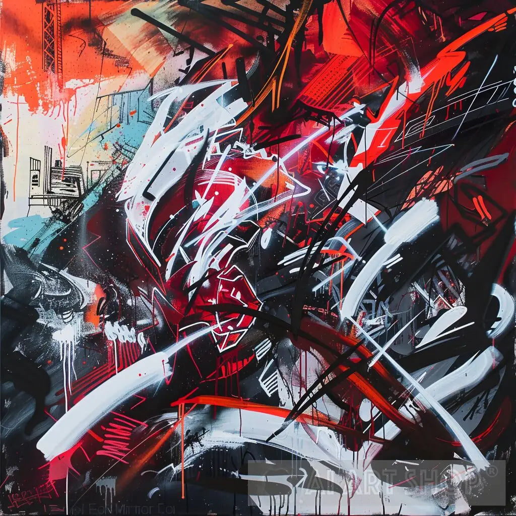 A public square with street art celebrating diversity and inclusion, depicted in deep reds, blacks, and metallics in graffiti style.