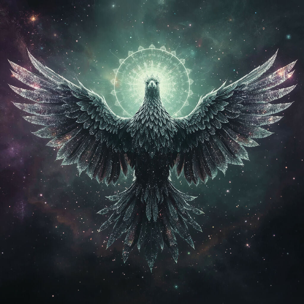 A majestic eagle spreads crystalline wings against a cosmic backdrop, its form rendered in intricate detail that suggests both organic life and geometric perfection. Behind the figure, a luminous mandala radiates sacred geometry, creating a halo of divine light that transforms the bird into an celestial messenger. The juxtaposition of natural form and spiritual symbolism evokes themes of transcendence, divine communication, and the bridge between earthly and heavenly realms. The eagle's powerful presence anchors the composition while the ethereal background suggests infinite spiritual dimensions. This synthesis of animal majesty and cosmic mysticism creates a contemporary icon exploring themes of elevation, divine connection, and the soul's eternal flight toward enlightenment.