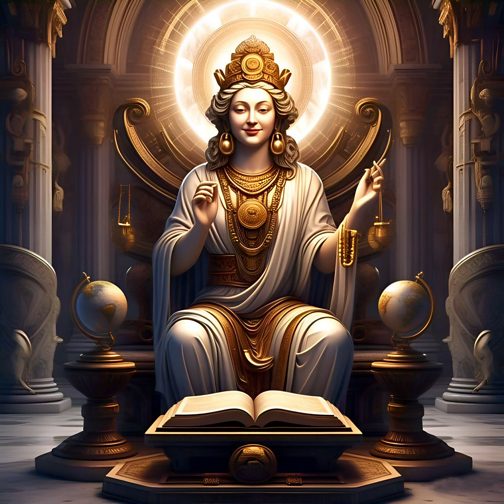 Elevate your space with "Divine Balance," a captivating AI-generated artwork that explores themes of justice, wisdom, and cosmic order. This surreal portrait features a majestic figure seated in an opulent hall, robed in gold and crimson, with a radiant halo emphasizing their divine presence. In one hand, the figure holds scales—signifying impartiality—and in the other, a quill, symbolizing the pursuit of truth through knowledge. Flanked by celestial globes and framed by architectural columns, the scene merges timeless symbolism with dreamlike precision. The open book and ambient light invite reflection, making this piece ideal for collectors drawn to depth, storytelling, and visual impact.