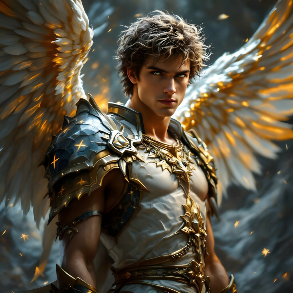 Piercing eyes, radiant wings, and golden armor forged with celestial light—this archangel radiates both divine fury and sacred command. Every detail speaks of heavenly power: the intricate armor etched with stars, the unwavering gaze of one who has seen eons of war and glory.
