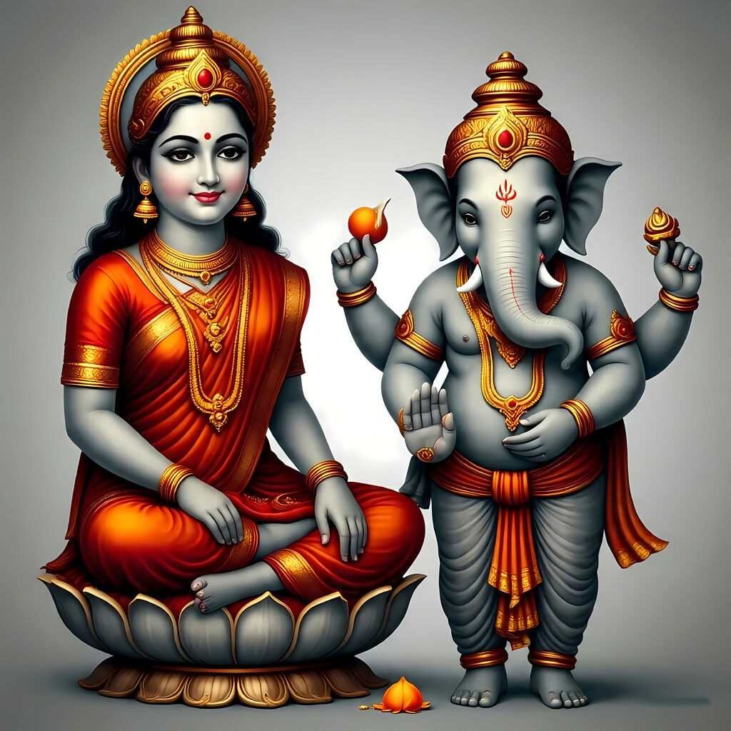 Celebrate the union of wisdom and prosperity with this vibrant modern AI artwork featuring Goddess Lakshmi and Lord Ganesha. Lakshmi, seated gracefully on a lotus, radiates serenity and abundance, while Ganesha stands in divine poise, symbolizing intellect and new beginnings. This piece reimagines sacred tradition through a contemporary lens, blending spiritual symbolism with digital artistry. Perfect for festive décor, meditation spaces, or as a cultural statement piece, this artwork invites blessings and balance into your life.