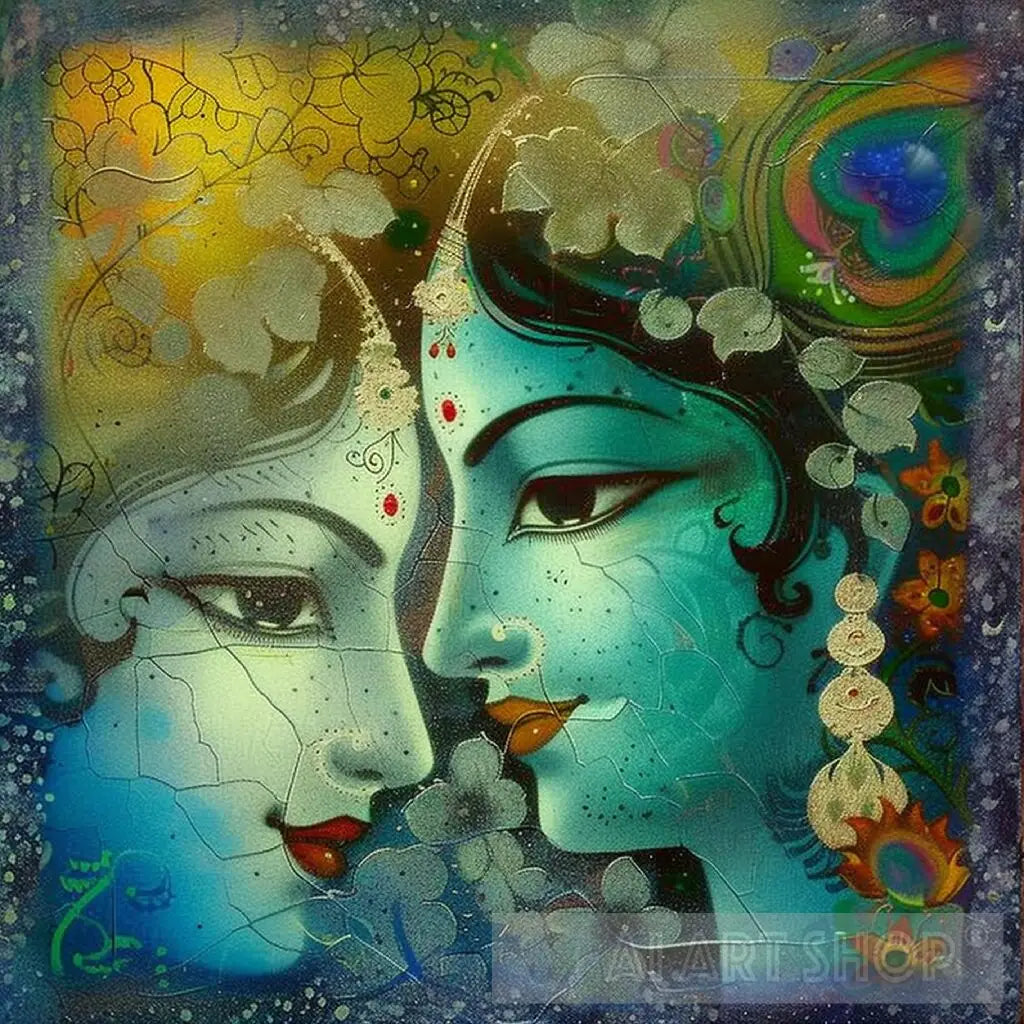 Divine Harmony: Radha-Krishna's Eternal Love" encapsulates the timeless essence of the divine couple, Radha and Krishna, radiating with boundless love and spiritual connection. Their entwined hands and affectionate gaze symbolize the eternal bond between devotee and deity, inviting viewers into a realm where devotion and bliss converge in celestial harmony.
