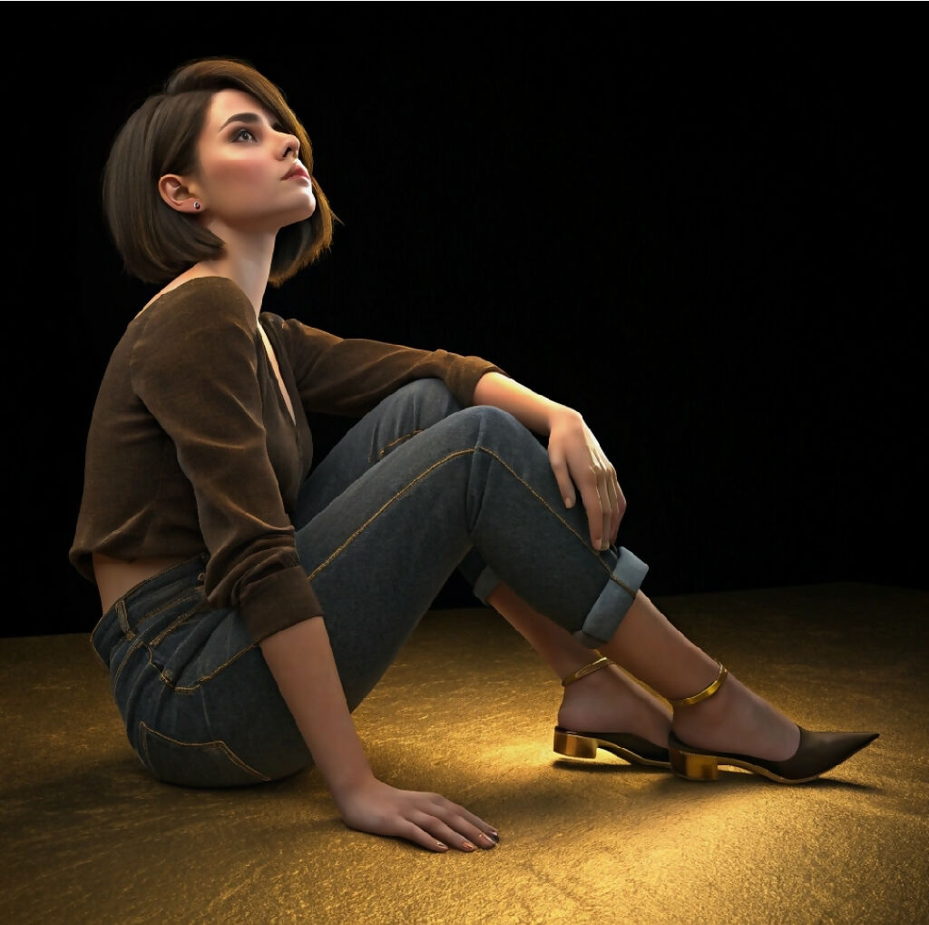 The image shows a person sitting on the ground with legs bent and arms resting on the knees. The person is wearing a brown long-sleeve top, blue jeans with visible stitching, and black shoes with gold accents. The background is dark, and the ground appears to have a golden texture. The person’s face is blurred out. The image is interesting due to the contrast between the dark background and the golden ground, as well as the stylish and modern clothing and accessories.