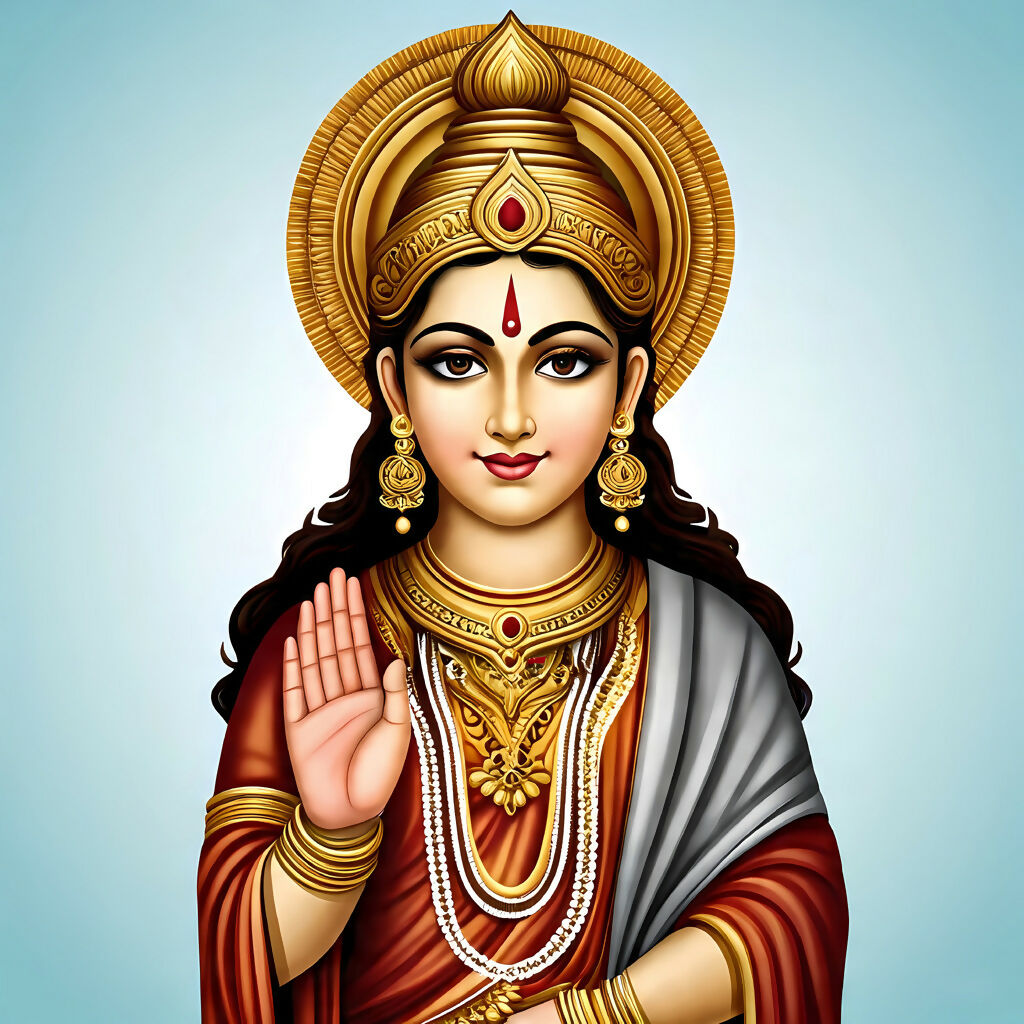 Step into a realm of serenity and spiritual elegance with Divine Radiance, a digitally crafted portrait of a revered Hindu deity. This AI-generated artwork captures the timeless grace of divine blessings through intricate jewelry, a majestic crown, and a tranquil expression. Inspired by centuries-old temple iconography, the raised hand in blessing symbolizes protection and peace. The soft blue gradient background evokes celestial calm, making this piece a perfect fusion of tradition and digital artistry. Ideal for spiritual spaces, meditation rooms, or cultural collections, this artwork bridges ancient devotion with modern expression.