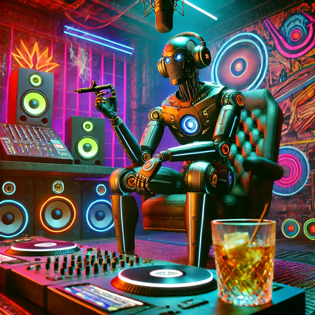"DJ Nexus" transports you to a high-energy cyberpunk music studio where a robotic DJ takes center stage. With glowing blue eyes and a luminous core, this AI-powered maestro mixes beats with unmatched precision and futuristic style. The studio pulses with vibrant neon lights, powerful speakers, and cutting-edge turntables, creating an electrifying atmosphere. The graffiti-covered walls and urban-inspired design blend seamlessly with advanced technology, making "DJ Nexus" a bold celebration of music, innovation, and cyberpunk culture.