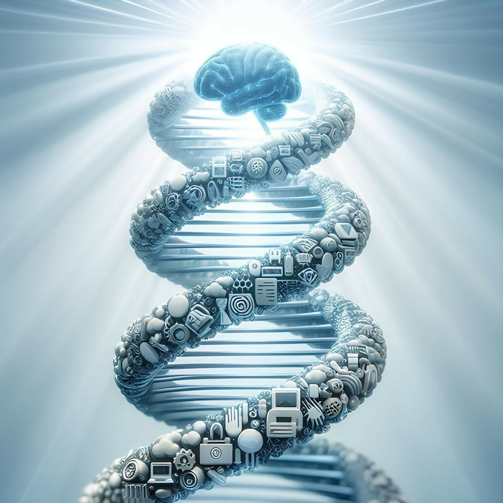 Explore the essence of human brilliance with this artistic depiction of DNA as the core of intelligence. A stunning fusion of science and imagination, this image captures the complexity, evolution, and beauty of the mind encoded in our genetic blueprint.