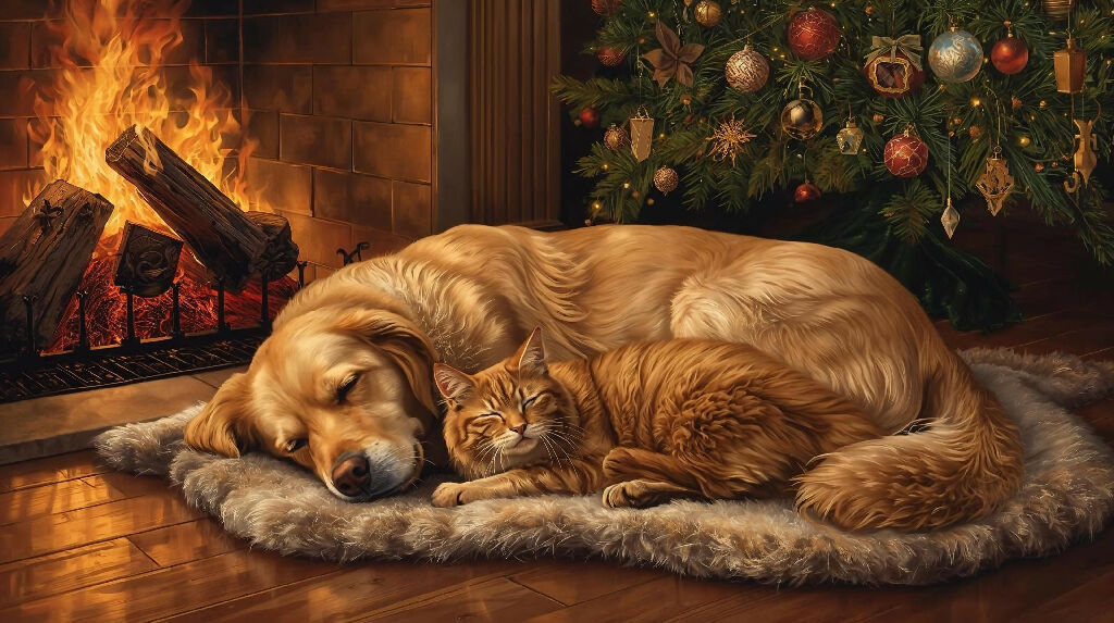 Adorable painting of a dog and cat snuggled by a fire on Christmas Eve.