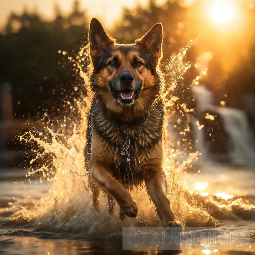 "Dynamic sunset scene captures German Shepherd dog in mid-air, surrounded by suspended water droplets. Conveys a refreshing sense of motion and energy, with attention to flowing hair and glistening droplets. Backlit setting adds a touch of drama."