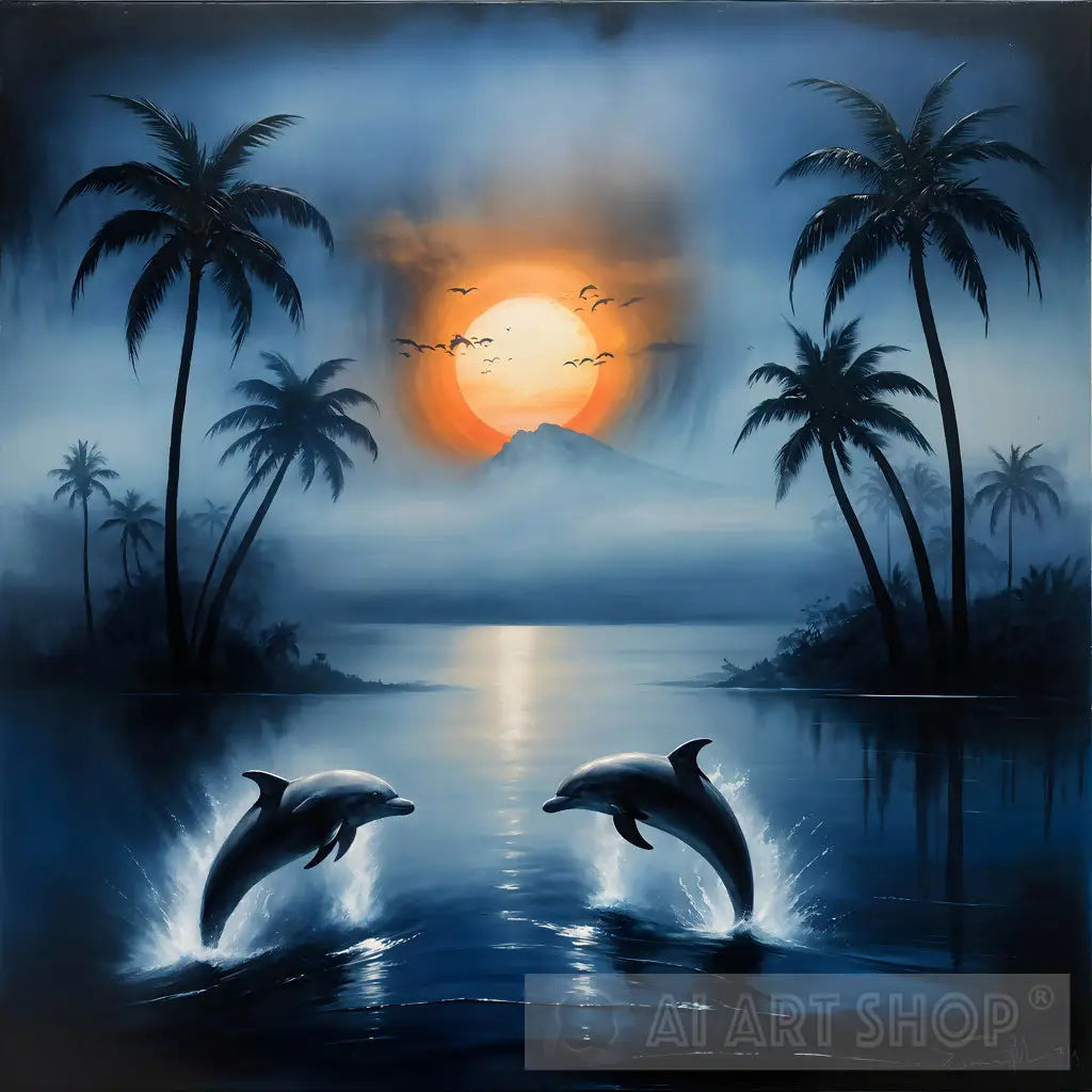 Dolphins at sunset. A beautiful AI painting for someone who loves dolphins. Feel the summer heat and watch a beautiful sunset, surrounded by palm trees and water.