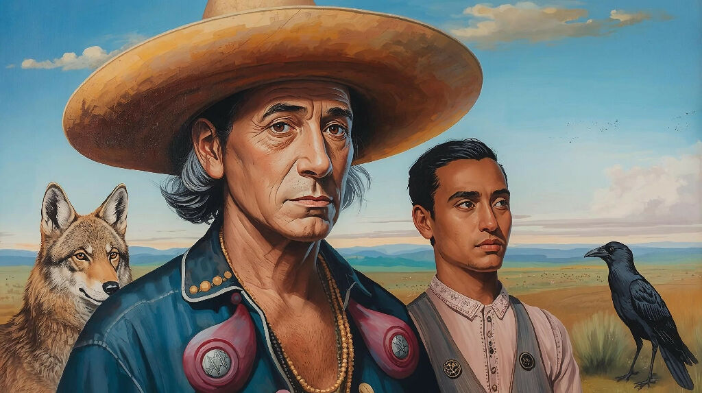 Surreal, vivid painting of the Indian spiritual master Don Juan with his student Carlos Castaneda.