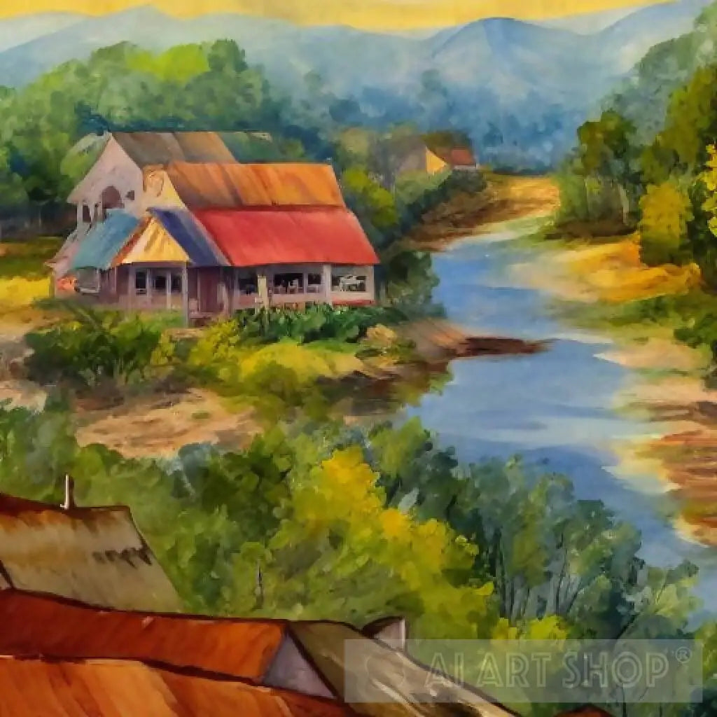 A scene from atop a cliff edge overlooking a village down by the riverside in the country.