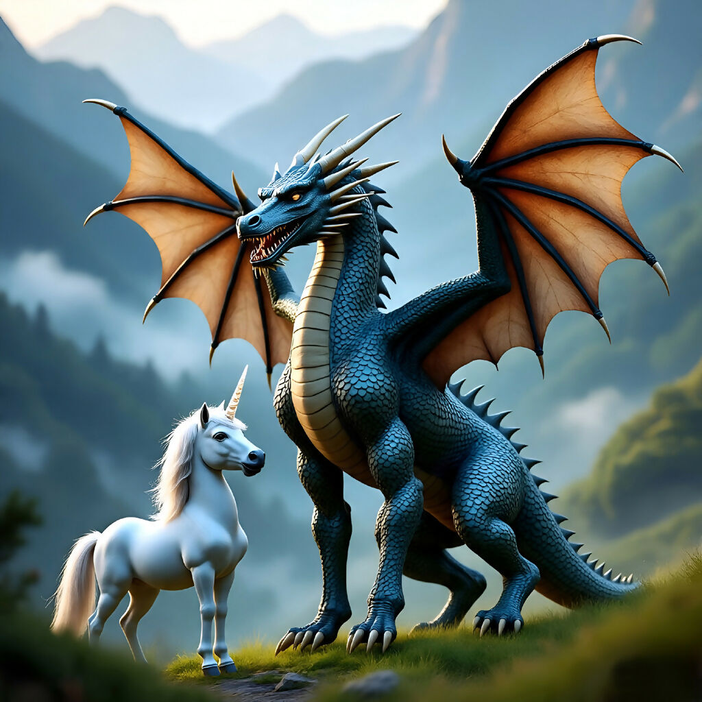 In a hidden valley shrouded in mist and legend, a fierce blue dragon and a graceful white unicorn stand side by side—symbols of power and purity. This AI-generated artwork captures a rare moment of harmony between two mythical forces, set against a breathtaking mountainous landscape. The glowing eyes of the dragon and the radiant horn of the unicorn hint at ancient magic, while the lush greenery and ethereal light evoke a timeless realm untouched by man. Perfect for fantasy lovers and dreamers, this piece invites you to imagine a world where opposites unite in peace.