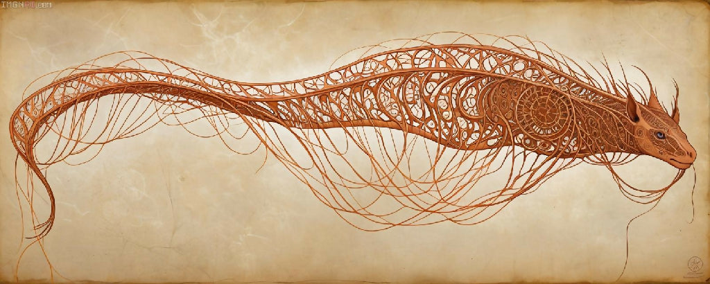 The image depicts an intricately designed, fantastical creature resembling a combination of a dragon and a sea serpent. Its body is elongated and serpentine, with a head featuring dragon-like characteristics such as pointed ears and a snout. The entire body is formed from an elaborate network of swirling, interwoven lines and patterns, giving it a delicate, almost lace-like appearance. These lines create complex geometric shapes and spirals, resulting in a visually captivating and detailed design. The background resembles a textured, parchment-like surface, enhancing the artistic and mythical feel of the image. There is no text or math problems present in the image.